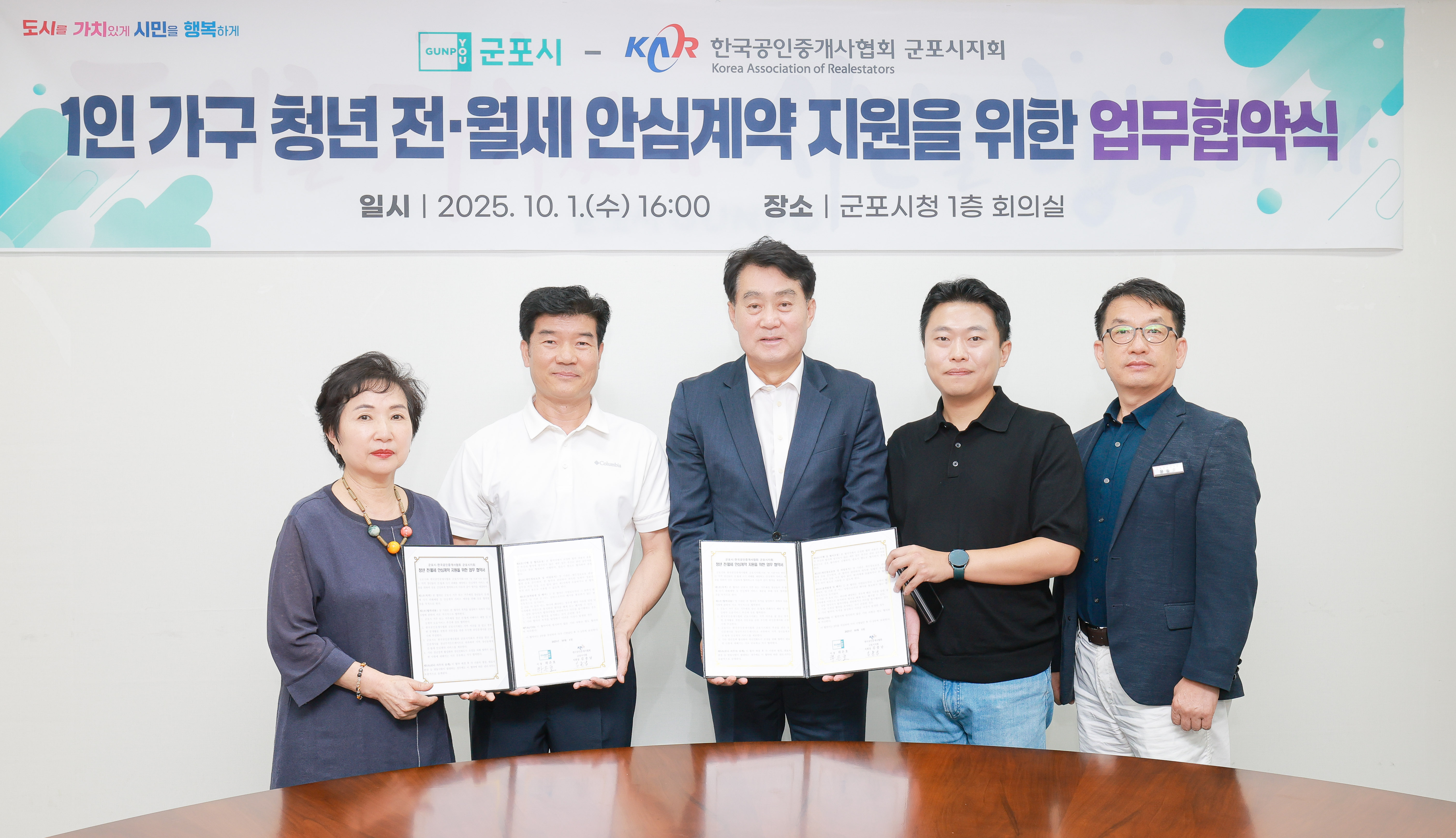 군포시는 10월 1일 시청에서 한국공인중개사협회 군포시지회와 청년 1인 가구 전월세 안심계약 지원을 위한 업무협약을 체결했다.